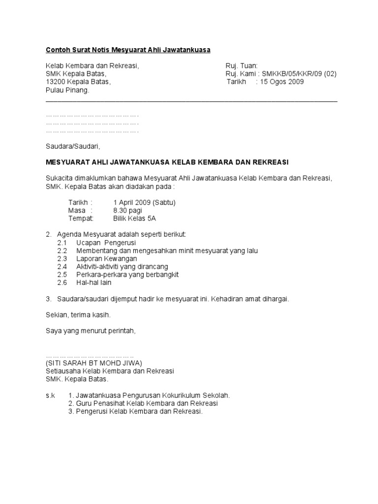 Minit Mesyuarat Ajk Khairat from imgv2-1-f.scribdassets.com Untuk memastikan perjalan pengurusan sekolah berjalan dengan lancar, mesyuarat perlu dilakukan. Kehadiran tuan/puan amat diharapkan bagi melancarkan perjalanan mesyuarat ini.kerjasama daripada tuan/puan didahului dengan ucapan ribuan terima kasih. Bagi mencapai objektif sedemikian, kita seharusnya mempunyai sumber dan rangka yang pelbagai dalam sampel sampel minit mesyuarat berkenaan. Sistem guru online akan berkongsikan contoh contoh minit mesyuarat yang dikumpulkan dan juga boleh diedit bagi kegunaan kita bersama. Ia juga merupakan bukti yang kuat kepada sesuatu perkara itu ada dibincangkan. Contoh surat bisnis, surat dinas, surat izin, surat kuasa, surat lamaran kerja, surat pemberitahuan, surat penawaran, surat pengunduran diri, surat peringatan, surat perjanjian, surat pernyataan, surat resmi, surat undangan. Biasanya, surat rekomendasi ini digunakan untuk. Text of contoh surat jemputan ke mesyuarat/taklimat.