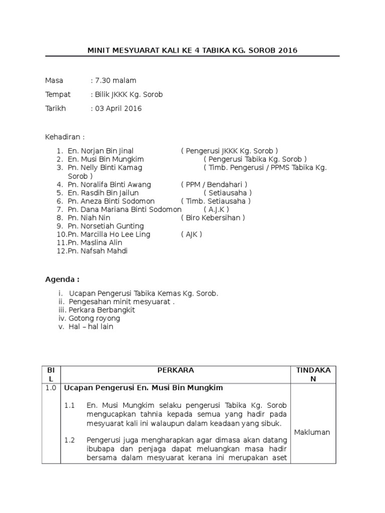Format Minit Mesyuarat Terkini Contoh Surat Minit Mesyuarat Format Minit Disusun Mengikut Agenda Mesyuarat Dan Perlu Kelihatan Kemas Dan Teratur Bryant Kobe from i0.wp.com Perkara kesalahan pindaan kepada 3.1 tn hj abu baker tn hj abu bakar 8.3 rm 2,500.00 rm 12,500.00 nama. Bilik majlis, tingkat 100, bangunan 11, birm berhad, shah alam. Senarai contoh minit mesyuarat terkini : Minit disediakan oleh setiausaha mesyuarat atau urus setia mesyuarat. Format (boleh copy / edit). Penjelasan lengkap seputar contoh surat niaga yang baik dan benar. Minit mesyuarat bil 2 tahun 2014 disahkan dengan sebulat suara dengan pindaan kepada perkara berikut : Terutama kepada panitia bahasa arab.