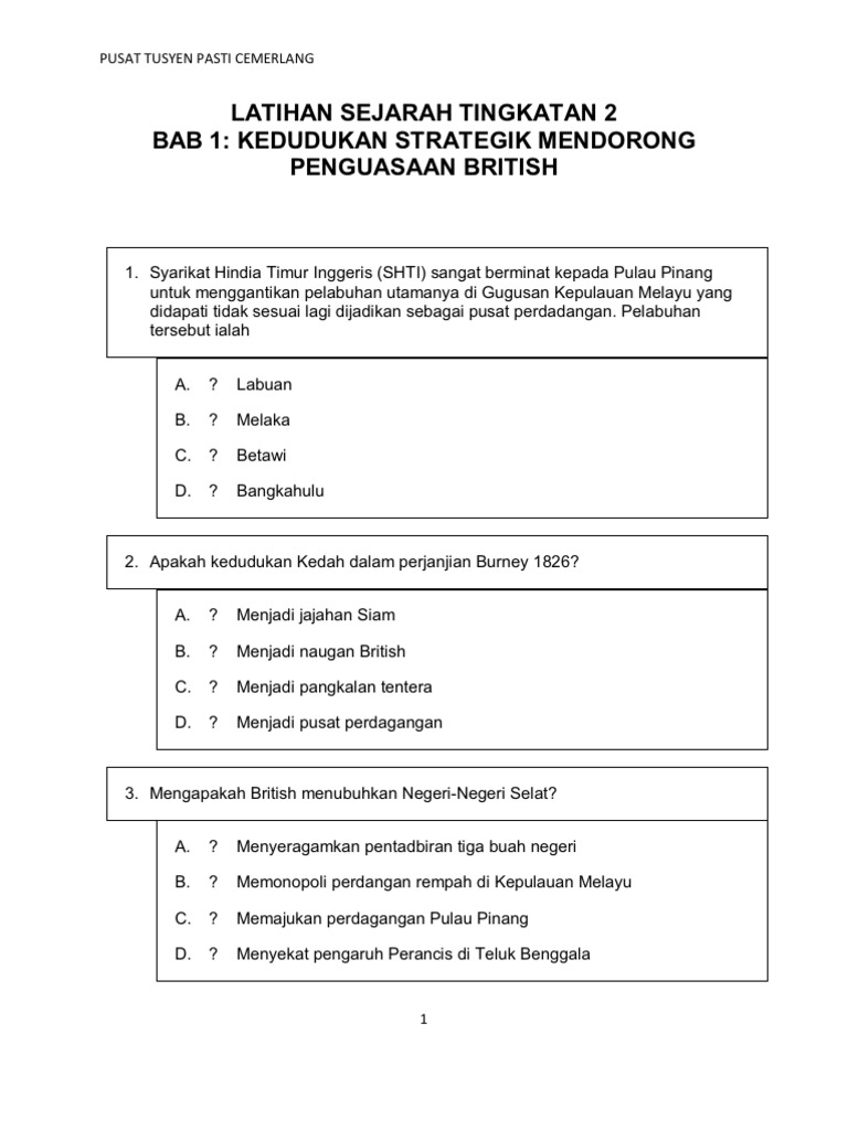 Slideshow untuk subjek sejarah tingkatan 2 (bab 1) 2018 kerajaan awal melayu. Kerajaan alam melayu yang mashyur. Nyatakan karya penulis sejarah awal. Koleksi soalan, nota, latihan … → → bank soalan peperiksaan dan koleksi nota untuk upsr, pt3, spm, stpm, muet. Latihan sejarah tingkatan 4 bab 5. Pertapakan syarikat hindia timur inggeris (shti) di pulau pinang pulau pinang merupakan sebahagian daripada kedah.(pusat. Malay salvar salvar latihan sejarah tingkatan 2 (bab 1 8) para ler mais tarde. Bagi setiap soalan ramalan, pilih satu jawapan sahaja. Add to my workbooks (4) download file pdf embed in my. Berikut merupakan latihan yang boleh digunakan untuk menguji kefahaman selepas menonton video di atas. Mengapakah shti berminat dengan negeri kedah? Panduan kerja projek rbt (reka bentuk dan teknologi via www.bumigemilang.com. Koleksi soalan peperiksaan percubaan pt3 + skema jawapan (semua subjek) (terkini).