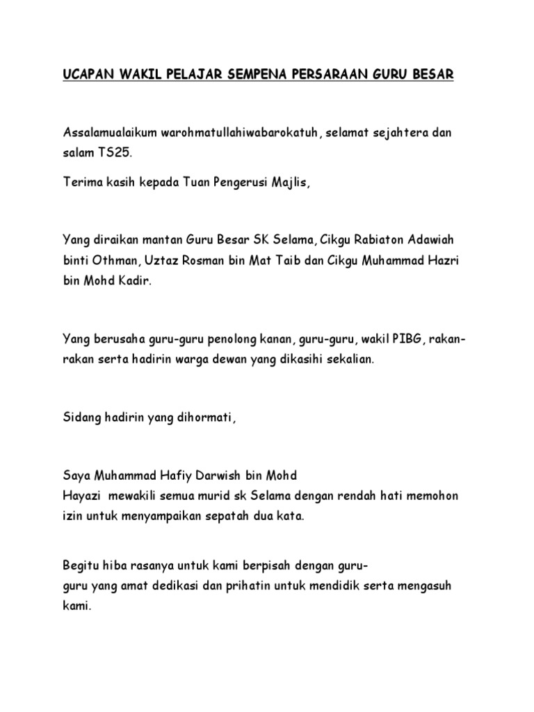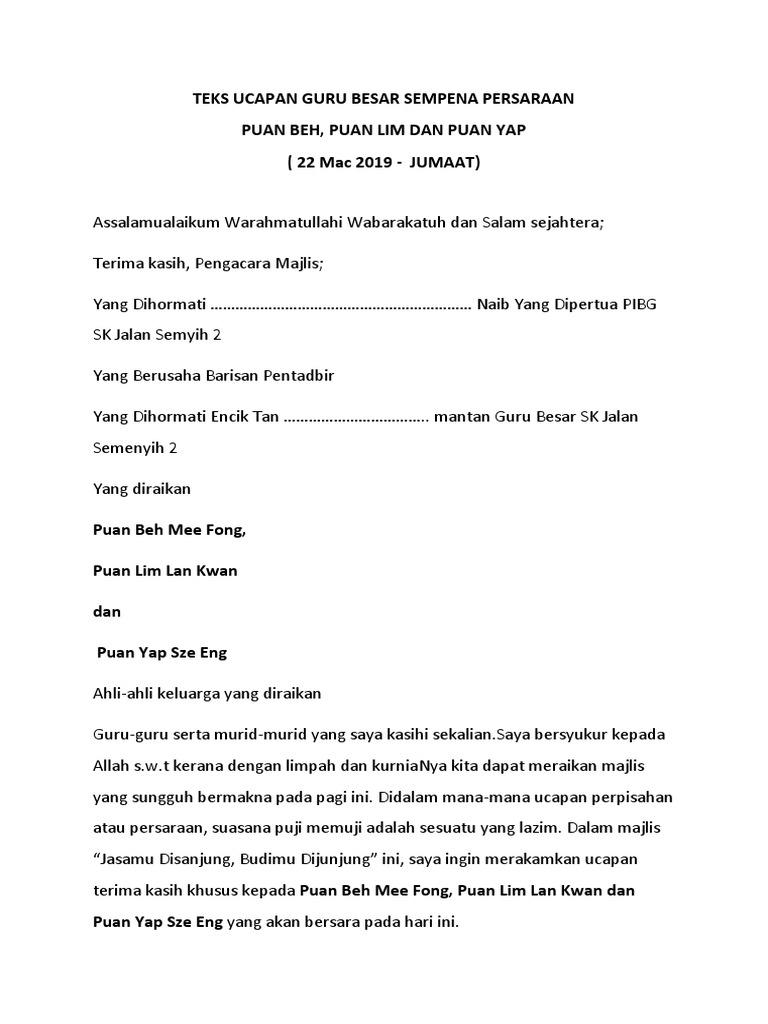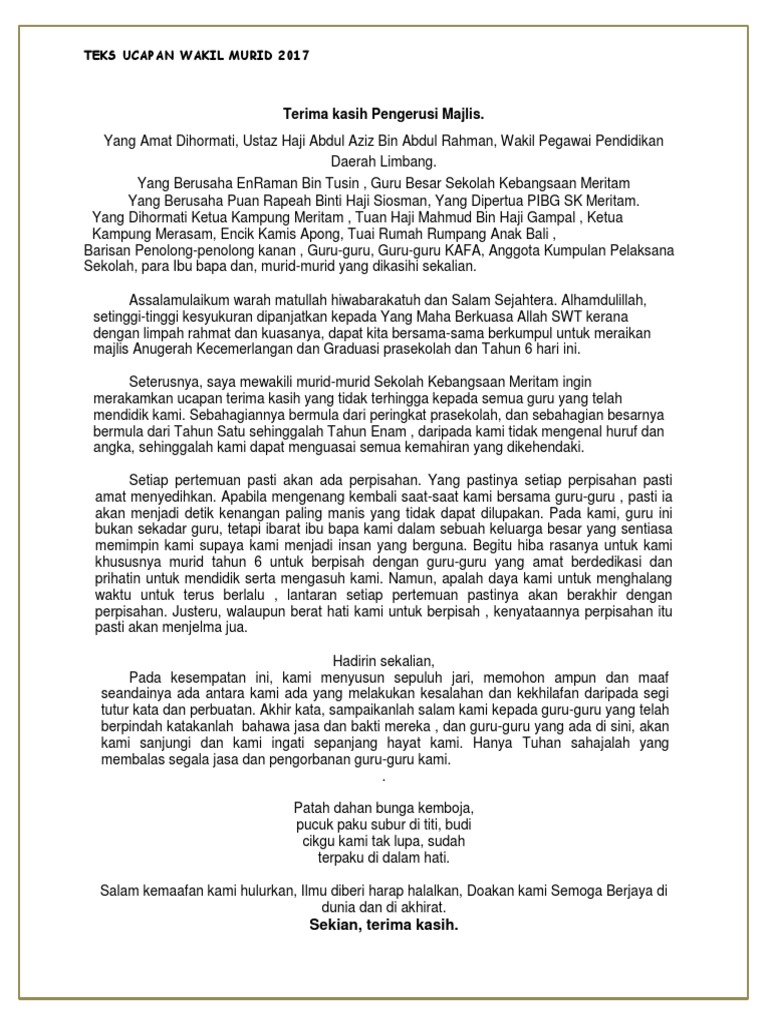 Teks ucapan yg lengkap.sezuai utk rujukan.saya mohon utk mengguna dan mengedit bbeberapa bahagian tertentu utk acara persaraan saya ya.terima kasih. Dipersilakan wakil persatuan ibu bapa dan guru bersama ucapan pengikat kasih. Ucapan wakil pelajar majlis perpisahan guru sk. Semoga perkongsian pada kali ini iaitu teks ucapan wakil murid sempena spm 2019 memberikan informasi terkini kepada anda semua berhubung dunia pendidikan di malaysia. Ucapan kepada pelajar, ucapan guru kepada murid, teks ucapan guru besar mesyuarat agung pibg, ucapan guru bertugas, ucapan guru teks ucapan pengacara majlis via www.slideshare.net.