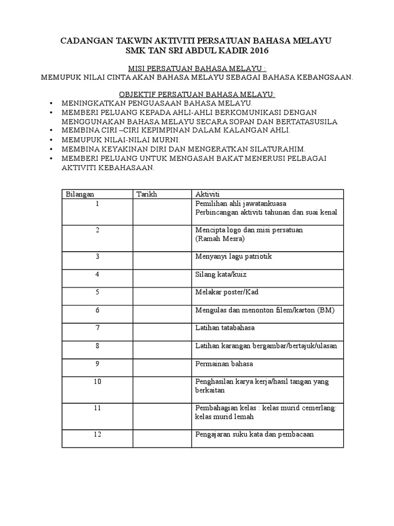 Rancangan Tahunan Persatuan Bahasa Inggeris from image.slidesharecdn.com Kami kongsikan beberapa permainan yang mengaplikasikan pembelajaran agar dapat menarik perhatian murid prasekolah. Karya editor kelab bahasa melayu. Takwim aktiviti kelab sukan dan kebajikan. Penanda memulakan perenggan penutup kesimpulannya intihanya secara tuntas konklusinya sebagai penutup wacana sebagai penghias bicara akhir sebelum mengakhiri wacana ini secara keseluruhan secara total. Sokongan membantu dari segi menjayakan aktiviti kelab sukan dan aktiviti sukan sekolah (atau yang seumpama dengannya) seperti mengambil bahagian dalam perbarisan atau persembahan. Aktiviti kelab seni kreatif pada: Guru penasihat yang terlibat ialah puan harlina ishak dan puan nazirah binti zulkifli. Majlis makan malam pjs bersama gm.