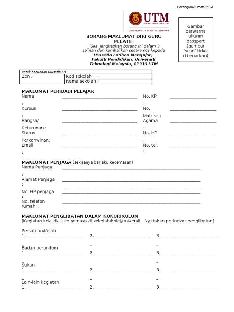 Sila berikan maklumat diri anda dengan tepat dan ikhlas. Maklumat diri guru pelatih (sila lengkapkan borang ini dalam 3 salinan dan kembalikan kepada urusetia latihan mengajar, fakulti pendidikan, utm, 81310 utm skudai). 1.1 maklumat diri 1.2 pengalaman/kemahiran 1.3 lampiran : Borang perakuan maklumat diri maklumat diri. Borang maklumat diri guru pdp.